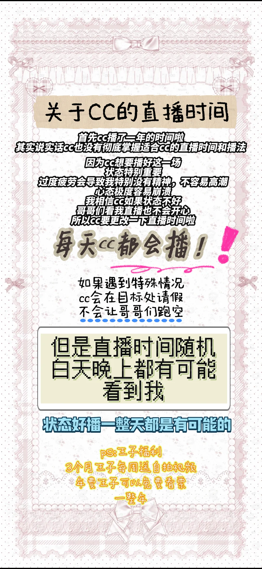 直播时间随机,白天晚上都可能看到我,状态好的时候会播一整天 cc不是什么体力达人,开票太多逼逼会流🩸,每天开票表演3场+,票价60-120,不时增加低价福利票,时间内容不同票价不同 身娇体软易脸红,反差S属性,调教请c2c哦~pvt表演无插入内容,插入请和我专属C2C哦 手机直播时大厅不露脸,开票露脸